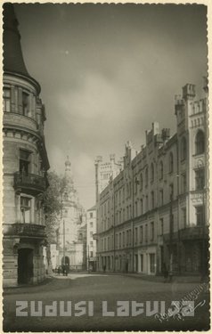Anotācija: Attēla kreisajā pusē nams Meža ielā 3, paralēls nr. Sētas 1 - īres un kantoru nams, t. s. "Āgenskalna tirdzniecības nams" (Hagensberger Kaufhaus), celts 1896.-1897. gadā, arhitekta A. Ašenkampfa projekts; līdz 1. pasaules karam īpašnieks tirgotājs J. Hanskinēvičs, 20. un 30. gados tirgotāja un grāmatizdevēja Dāvida Golta /Zeltiņa/ īpašums. 19., 20. gs. mijā tur, "Āgenskalna tirdzniecības namā" (tolaik saukts arī par "Hanskinēviča bazāru"), atradās vairāk nekā 10 dažādu preču tirgotavas, frizētava, juvelierdarbnīca, J.Grēninga fotodarbnīca, Rīgas 2. pasta un telegrāfa kantoris. "Pēc Maskavas Petrovskas pasāžas parauga blakām tirgus laukumam uzcelts Hanskinēviča bazārs - gara ēka ar sīkpreču bodītēm un "spranču magazīnām", kur bijis nopērkams itin viss: ar naglām un sāli sākot, federvāģiem, uzvalkiem un cepurēm beidzot... Šobrīd bazāra ēka nožogota no ielas un pievienota aviācijas institūta teritorijai." [Zariņš M. Stāsts par Āgenskalnu // Grāmata. 1990, IV 64. lpp.]