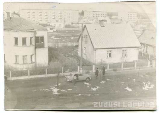 Anotācija: Attēlā redzamas privātmājas Murjāņu ielā 79 un 81. Dziļumā privātmājas Lilastes ielā 24, 26, 28. Aiz tām daudzdzīvokļu namu Lilastes ielā 5, daļu no divstāvu dzīvokļu namiem Lilastes ielā 7 un Skrudalienas ielā 15, un Juglas ielas 37 un 39 dzīvokļu namus. Priekšplānā uz ietves novietots auto Moskvich-401.
