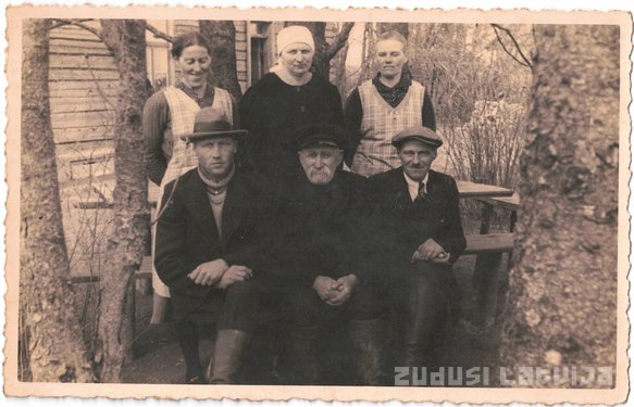 Anotācija: Pirmajā rindā no labās Adolfs Eglītis, otrajā rindā priekšautos No kreisās Minna Eglīte labajā pusē Anna Eglīte.