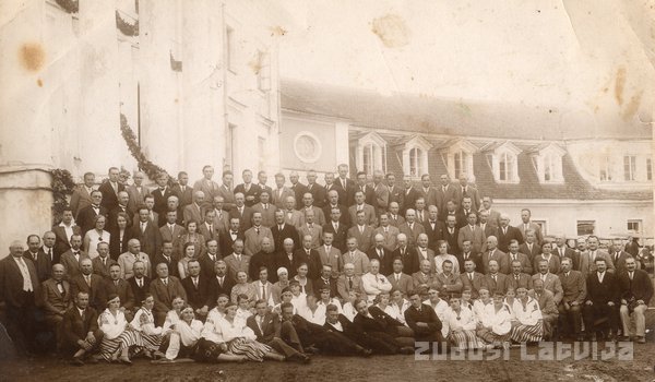 Anotācija: Latvijas agronomu 2. sanāksmes dalībnieki Kaucmindes mājturības skolā 1930. gada 20. augustā.