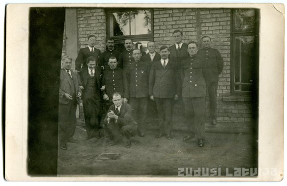 Anotācija: Ventspils pasta kantora darbinieki pie pasta ēkas. Pirmais no kreisās Pēteris Koškins (dzimis 1884. 2. sept Rīgā).